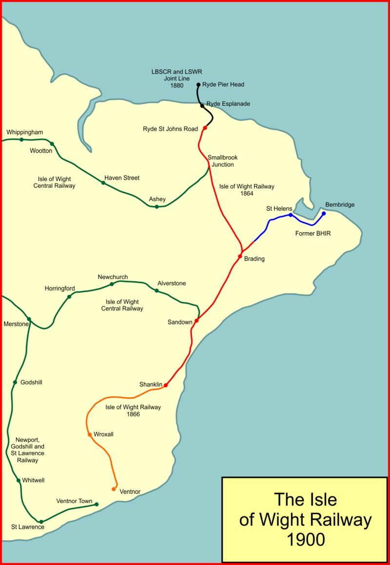 | The Isle of Wight Railway was a railway company on the Isle of Wight, United Kingdom; it operated 14 miles of railway line between Ryde and Ventnor. It opened the first section of line from Ryde to Sandown in 1864, later extending to Ventnor in 1866. The Ryde station was at St Johns Road, some distance from the pier where the majority of travellers arrived. A tramway operated on the pier itself, and a street-running tramway later operated from the Pier to St Johns Road. It was not until 1880 that two mainland railways companies jointly extended the railway line to the Pier Head, and IoWR trains ran through, improving the journey arrangements.
