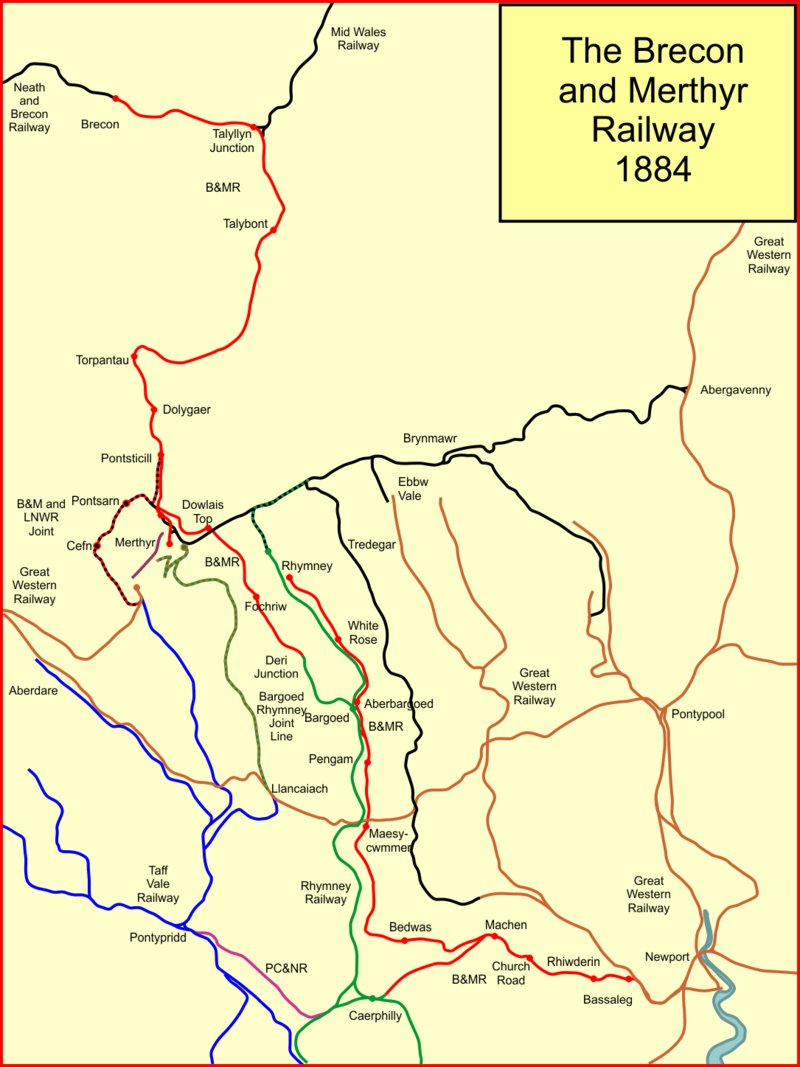 | The Brecon and Merthyr Tydfil Junction Railway (B&MR) was a railway company in Wales. It was originally intended to link the towns in its name. Finding its access to Merthyr difficult at first, it acquired the Rumney Railway, an old plateway, and this gave it access to Newport docks. This changed its emphasis from rural line to mineral artery. It opened at the Brecon end to a point near Dowlais in 1863, and in 1865 it opened a disconnected section from Rhymney to Newport. In due course the company connected the two sections and reached Dowlais and Merthyr, but had to concede sharing a route with the powerful London and North Western Railway. The B&MR was always short of money, and was notable for its prodigious gradients, but it survived until the grouping of 1923, when it became part of the Great Western Railway. Its network declined steeply after 1945, and passenger operation ceased in 1962. Goods and mineral operation also lost its market, and as of 2020, only a short stub to a quarry at Machen remains rail connected.
