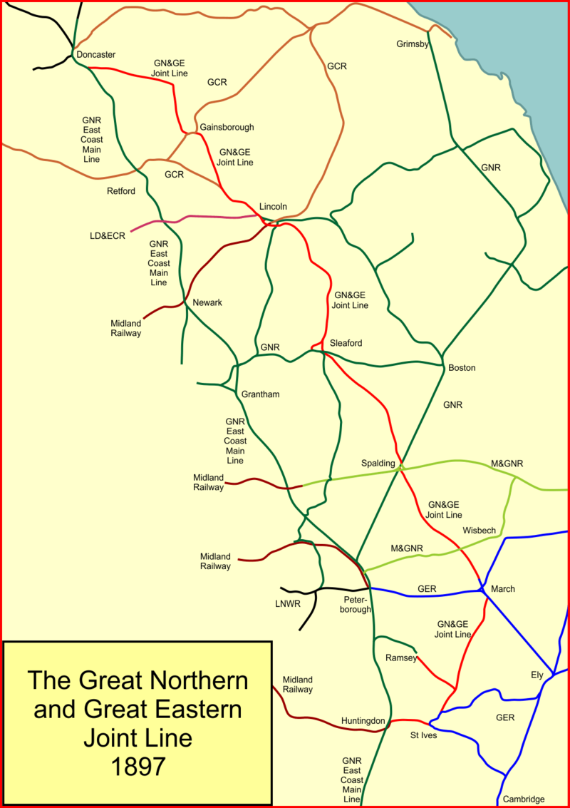 | The Great Northern and Great Eastern Joint Railway, colloquially referred to as "the Joint Line"[1] was a railway line connecting Doncaster and Lincoln with March and Huntingdon in the eastern counties of England. It was owned jointly by the Great Northern Railway and the Great Eastern Railway. It was formed by transferring certain route sections from the parent companies, and by the construction of a new route between Spalding and Lincoln, and a number of short spurs and connections. It was controlled by a Joint Committee, and the owning companies operated their own trains with their own rolling stock. The Joint Line amounted to nearly 123 miles of route. on 3 July 1879 the Parliamentary Bill authorising the Joint Line was passed.